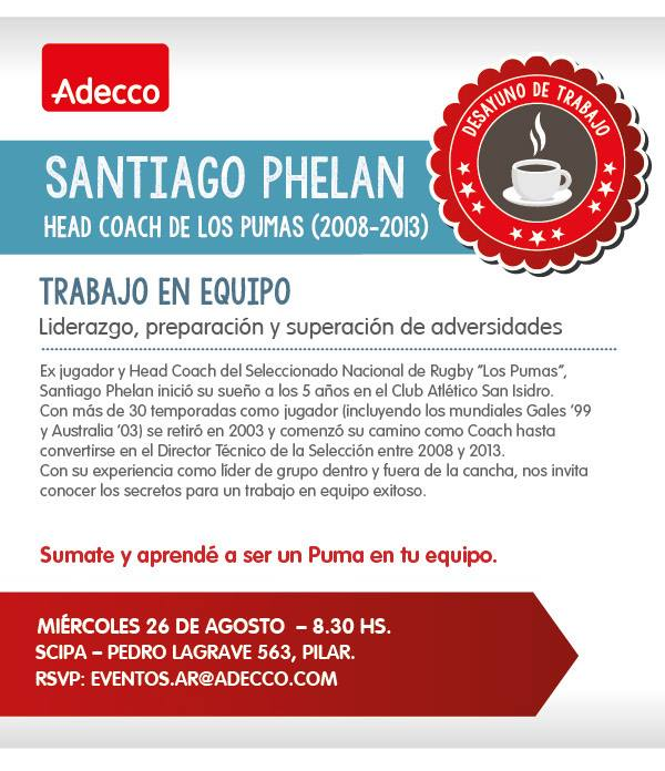 Adecco Argentina desafía a “ser un Puma en tu equipo” y para ello organiza un desayuno de trabajo en la sede de la Cámara de Comercio de Pilar (Pedro Lagrave 563) el próximo miércoles 26 de agosto a las 8.30 hs con Santiago Phelan (head coach de Los Pumas 2008-2013) quien hablará sobre «Trabajo en Equipo. Liderazgo, preparación y superación de adversidades».