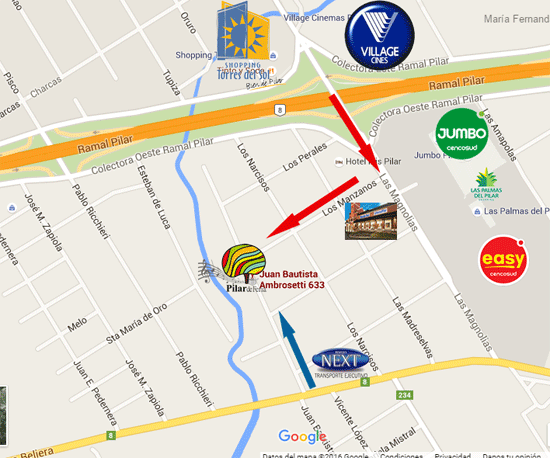 O altura km 50 de ruta 8, tomar la calle del destacamento policial y de allí son tres cuadras sobre Ambrosetti (en la esquina de ruta 8 está Remises Next)